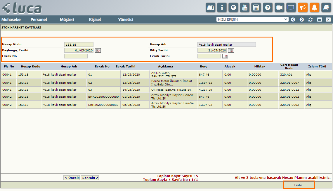 Bu ekranda Hesap Kodu, Başlangıç ve Bitiş Fiş Tarihleri, Evrak No ve Evrak Tarihi Parametrelerini doldurup Liste butonuna tıklayarak istenilen kayıtlara ulaşılabilir.