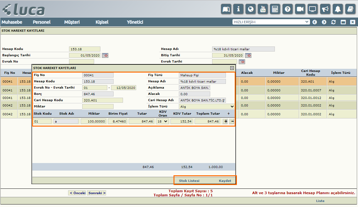 Muhasebe – Stok İşlemleri – Stok Hareketleri Düzenleme ekranı stoklu işlenen hareketleri ve stok bilgileri girilmeyen muhasebe kayıtlarını düzenlemeye yarayan bir ekrandır.