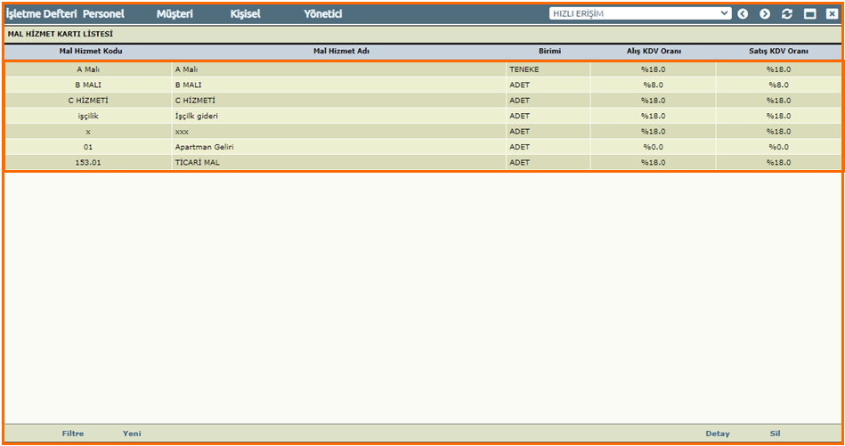Mal Hizmet kartlarını listelemek için Liste kutucuğuna basınız.