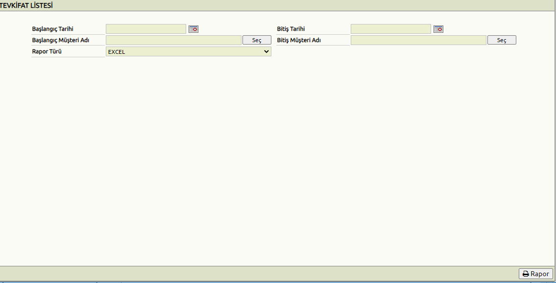 Müşteri adı vererek tek bir müşterinin tevkifat raporunu alabileceğiniz gibi, müşteri adı vermeyerek tüm müşterilere ait tevkifat raporunu alabilirsiniz.