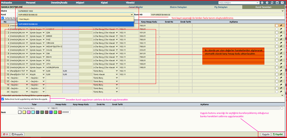 Burada yer alan kural tanımlarına göre uygun koşulları sağlayan satırların karşı hesap kodları otomatik olarak gelecektir.