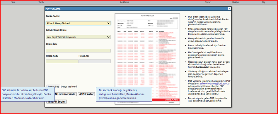 Bu seçenek aracılığı ile 600 satıra kadar olan PDF dosyalarınızı yükleyerek direk Banka Aktarım (Excel) alanına aktarabilirsiniz.