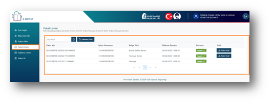 E-defter sayfasında “paket listesi” alanından gönderilen dosyaları görebilirsiniz.